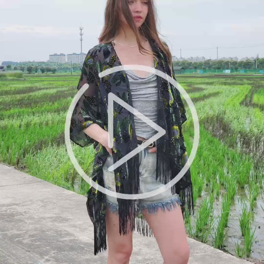 USHOWHEY velvet print burnout kimono cardigan tassel bathing suit cover ups